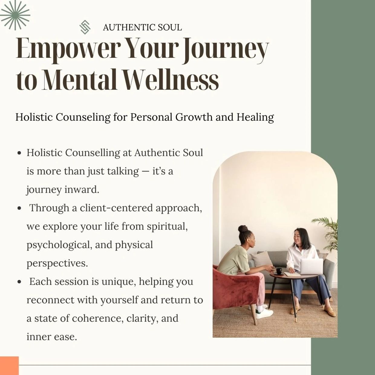 Client-centered sessions exploring the connection between mind, body, and spirit, incorporating a free consultation, and alternative therapies — supporting you to return to coherence, clarity, and inner ease.